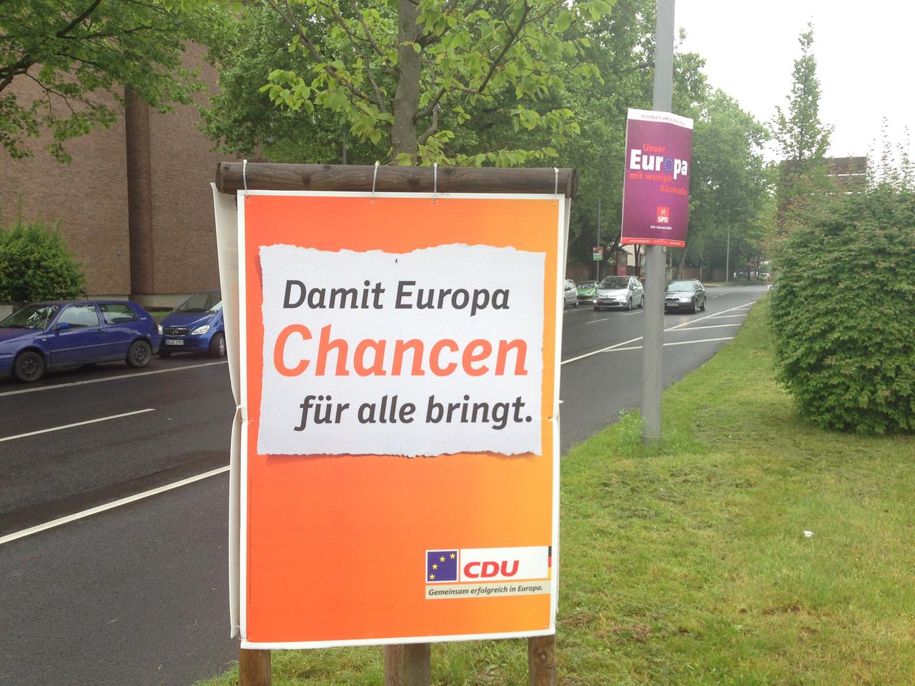 Die SPD setzt auf den europäischen Zusammenhalt: „Ein Europa des Miteinanders. Und nicht des Gegeneinanders". Bloß keine Experimente macht die CDU: „Damit Europa Chancen für alle bringt". Altbekannte Parolen kommen von den Linken und Grünen: Mehr Geld für die Armen fordern die einen, die anderen setzen auf's grüne Image.
