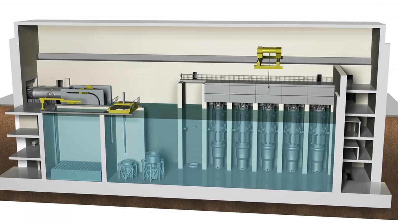 Stehen sollen die Module nebeneinander in einem mit 28 Millionen Liter Wasser gefüllten Pool. Der dient auch als Abklingbecken für die Brennelemente. Und dann ist das Becken Wärmesenke für den Notfall. Berechnungen zufolge soll es selbst dann 30 Tage lang die Kühlung garantieren, wenn alle Module gleichzeitig havarieren. Und da in den kleinen Reaktoren bei Weitem nicht so viel Zerfallshitze entstehe wie in einem großen, sei bis dahin die Gefahr einer Kernschmelze gebannt - ohne dass irgendjemand eingreifen müsste.