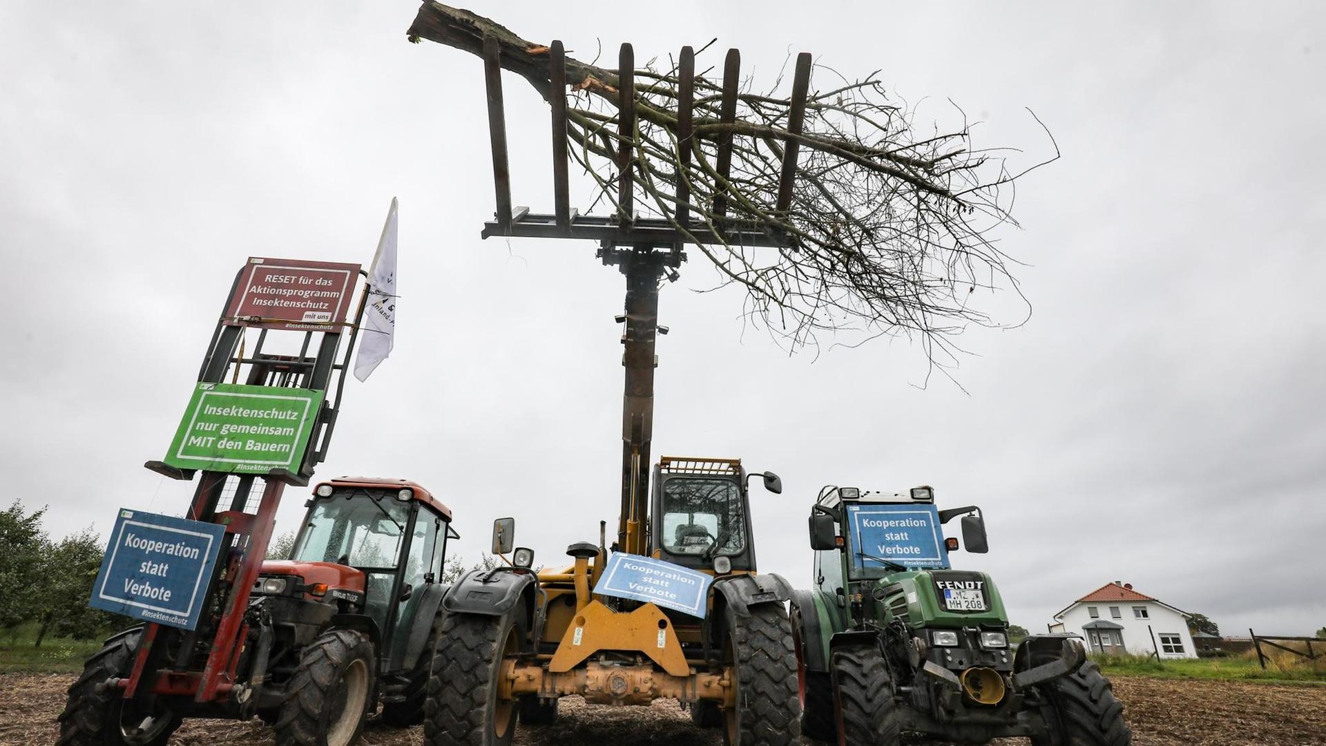 Eine gespenstische Protest-Szenerie vor dem Tagungshotel der Minister im Mainzer Obstanbau-Vorort Finthen: Trecker stehen in Reihe auf einem Feld, ihre Schaufeln recken gerodete Obstbäume in die Höhe. Soll heißen: Wenn die Bundesregierung ihr Insektenschutzprogramm in Gesetzesform gießt, werden noch mehr Bauern aufgeben.