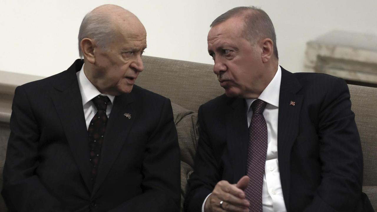 Regentropfen prasseln auf den schwarzen Schirm von Recep Tayyip Erdogan. Der türkische Staatspräsident ist im strömenden Regen gekommen, um seinen Bündnispartner zu besuchen: Devlet Bahceli, den Vorsitzenden der rechtsextremen türkischen Nationalistenpartei. "Elhamdulillah, rahmetle geldik", mit Gottes Segen komme er, sagt Erdogan zur Begrüßung. Dann ziehen sich die beiden zu Beratungen ins Haus zurück.